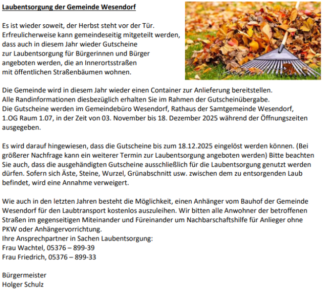 Bei Interesse wenden Sie sich an das Gemeindebüro – Frau Anne Hesse, Tel.: 05376-89926 oder per Mail an: a.hesse@gemeinde-wesendorf.de