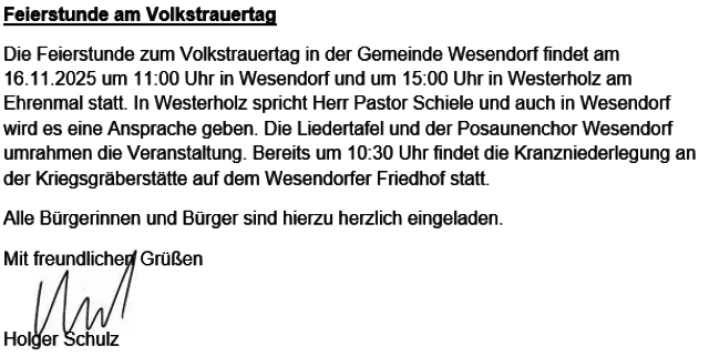 Am Sonntag, 16. November 2025 fanden in Wesendorf und Westerholz die Gedenkveranstaltungen zum Volkstrauertag statt. Der Tag bot den Teilnehmenden die Gelegenheit, der Opfer von Krieg und Gewalt zu gedenken und innezuhalten.